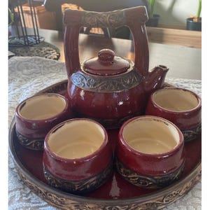 This is a set of four tea cups and saucers made by Homer Laughlin in the United States. The cups and saucers are ceramic and have a multicolor design. The set is vintage and original, and features the Fiesta product line. The backstamp is painted and the set includes four cups and four saucers. It is suitable for all occasions and has a contemporary style.